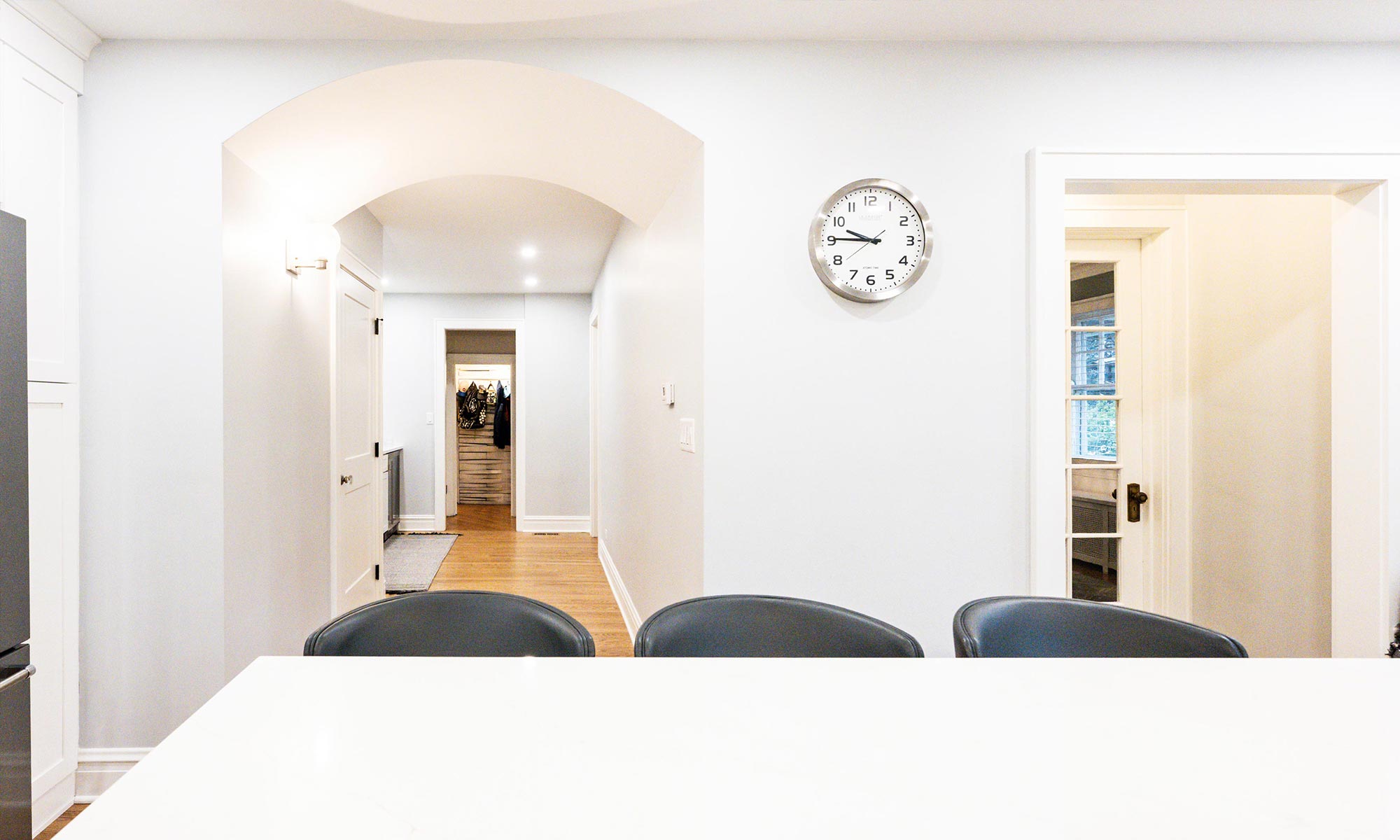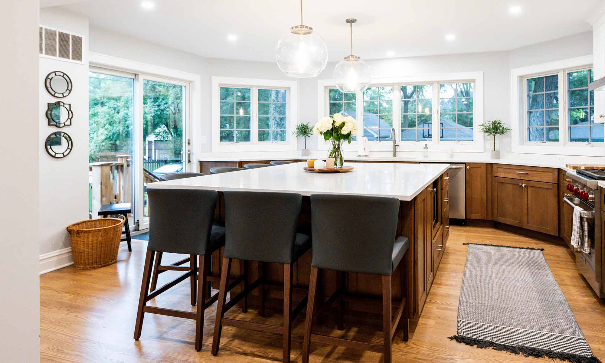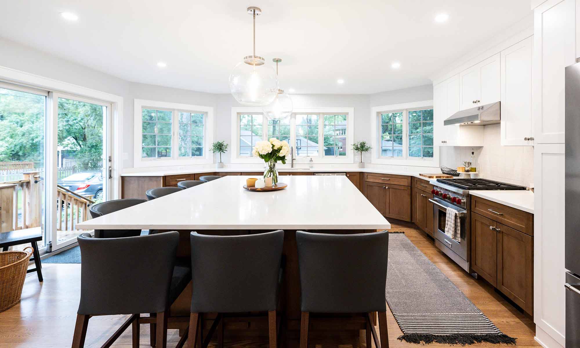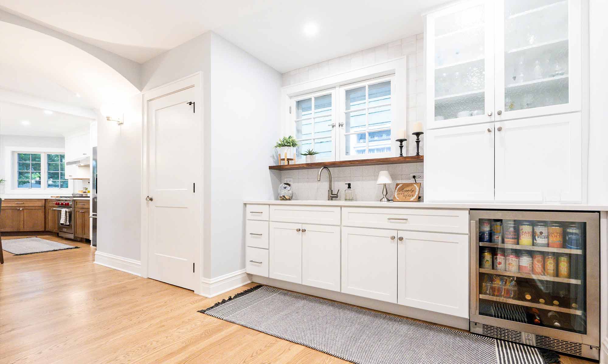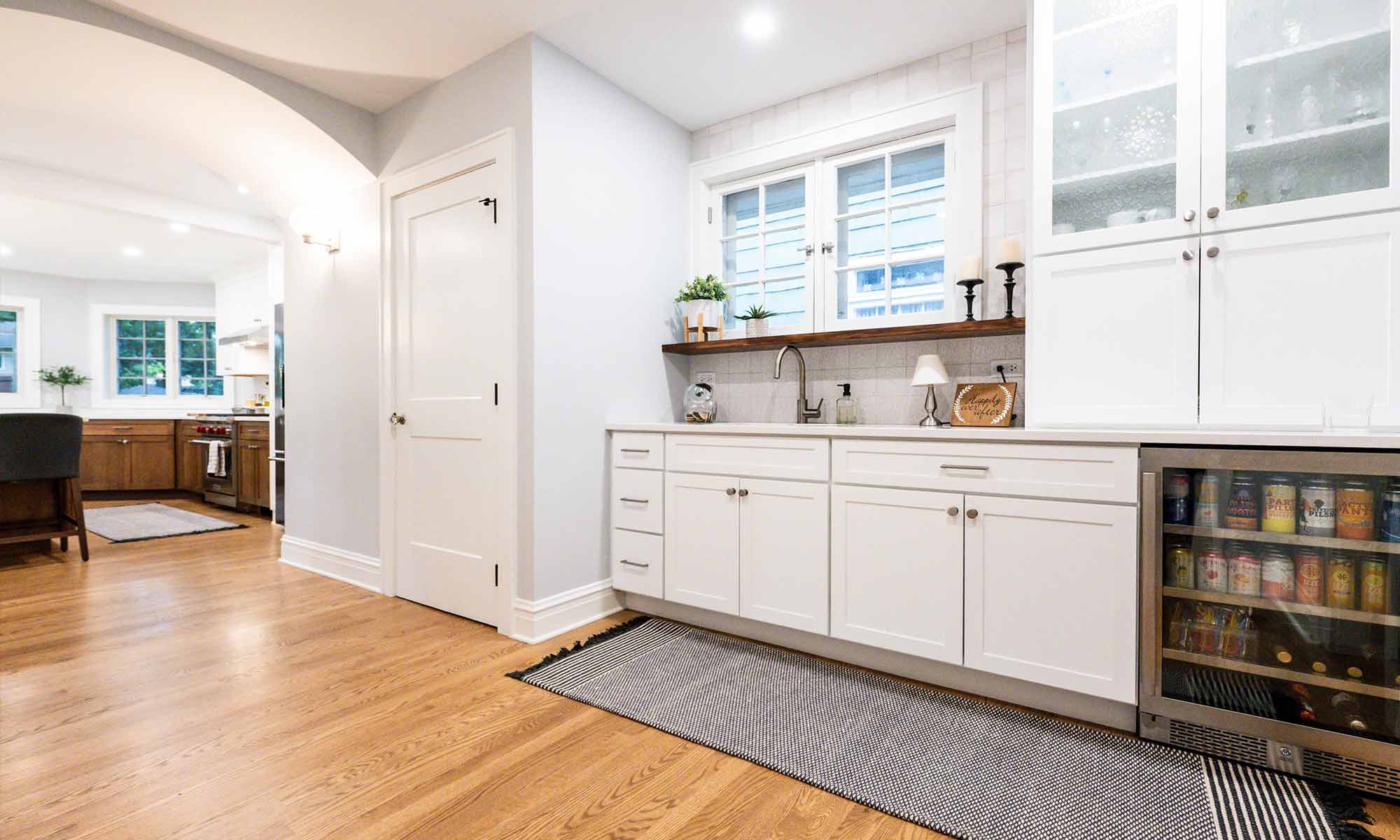 The new kitchen addition space is anchored by a massive island with seating for seven. The exterior walls are in an octagon form mirroring the original design on the front of the home with three walls filled with windows offering natural light and views of the backyard. The previous kitchen area was converted to a coffee, breakfast, and beverage station complete with it’s own sink, fridge, floating wood shelf, and ample storage.