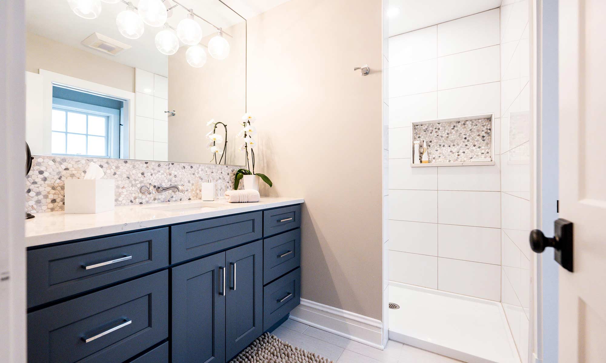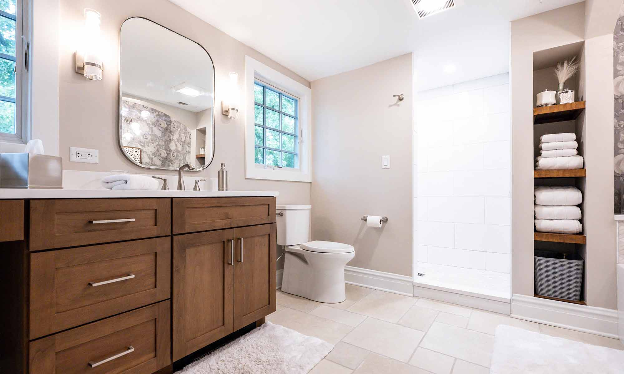 The benefits of the addition also allowed an expanded full basement and a remodel above for a more usable primary suite. While building the first floor addition, our construction team was able to keep the existing second floor spaces intact, and then remodel them to house a new primary bathroom complete with walk-in shower, soaking tub, and makeup station. The rearranged spaces also allowed for a new hall bath layout offering more functional and efficient spaces and a much needed facelift.