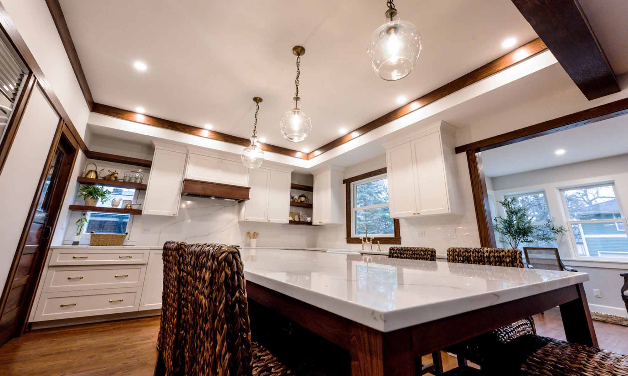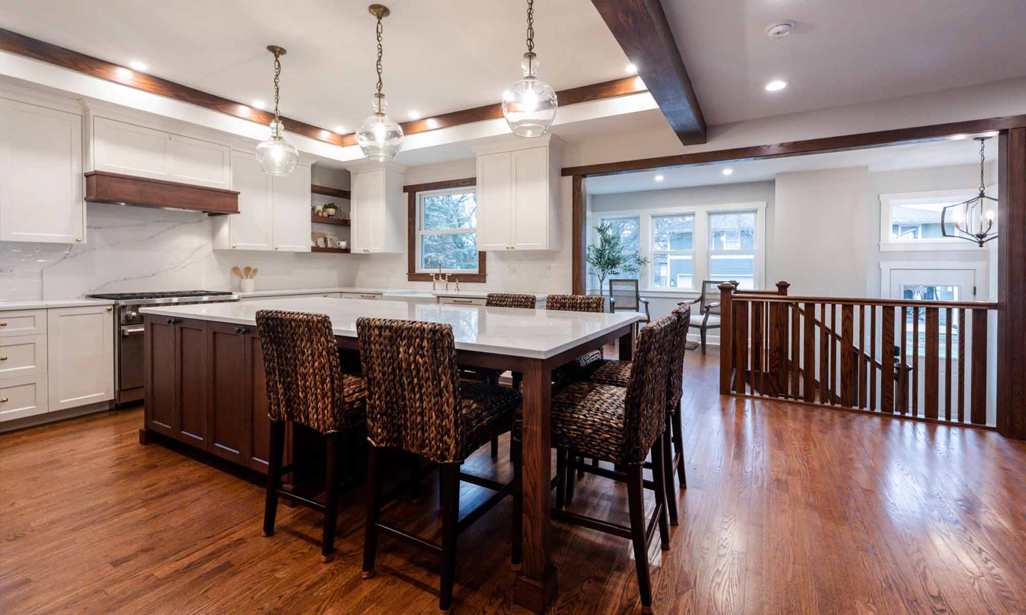 By moving and expanding circulation and storage functions to the addition, the new kitchen space had room for an expansive island with seating, a walk-in pantry, and an oversized fridge and range. Keeping the craftsman details alive in the new, the structural beam was wrapped in matching oak, and soffits incorporated oak band boards to accentuate the horizontal. The result is a kitchen worthy of this incredible piece of history, and a new social center for this wonderful family.
