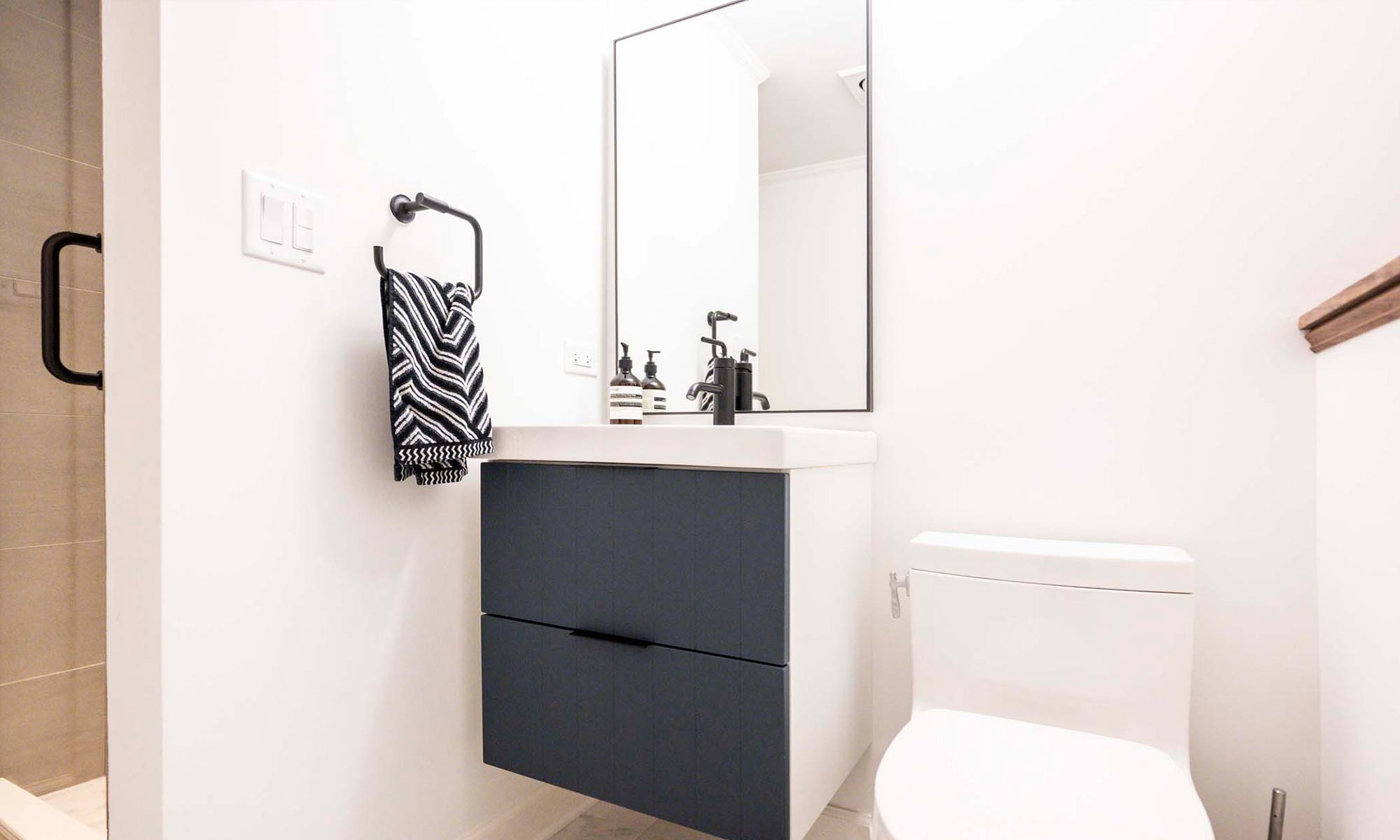 The kitchen design set the stage for the pallet for the rest of the spaces, and every single one of the remodeled bathrooms has touches of custom design and creativity. The laundry room features walnut floating shelves, and a dark textured blue backsplash tile. Lastly the existing bank of colonial french doors was replaced with a custom designed and built white oak and black louver wall.